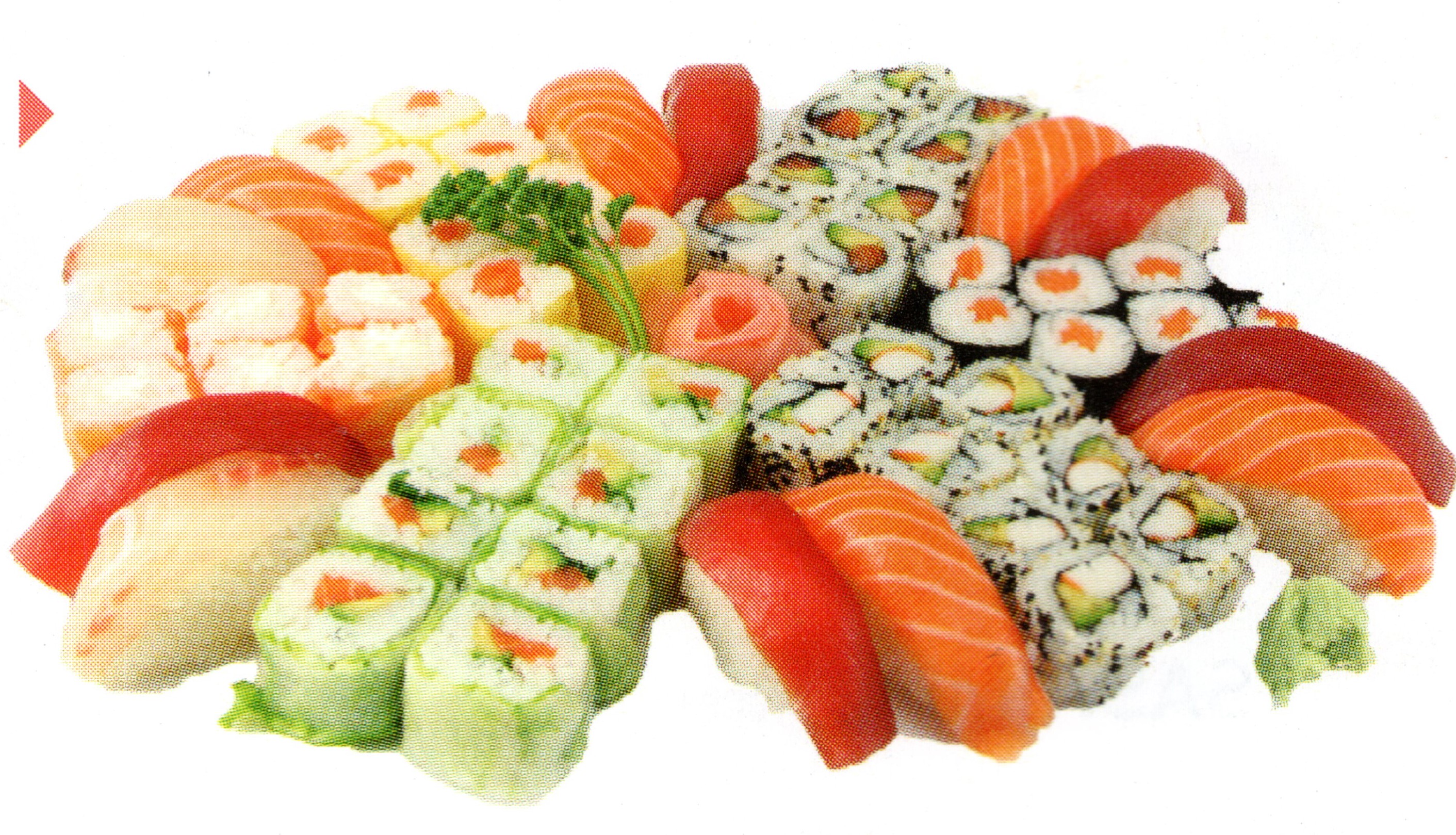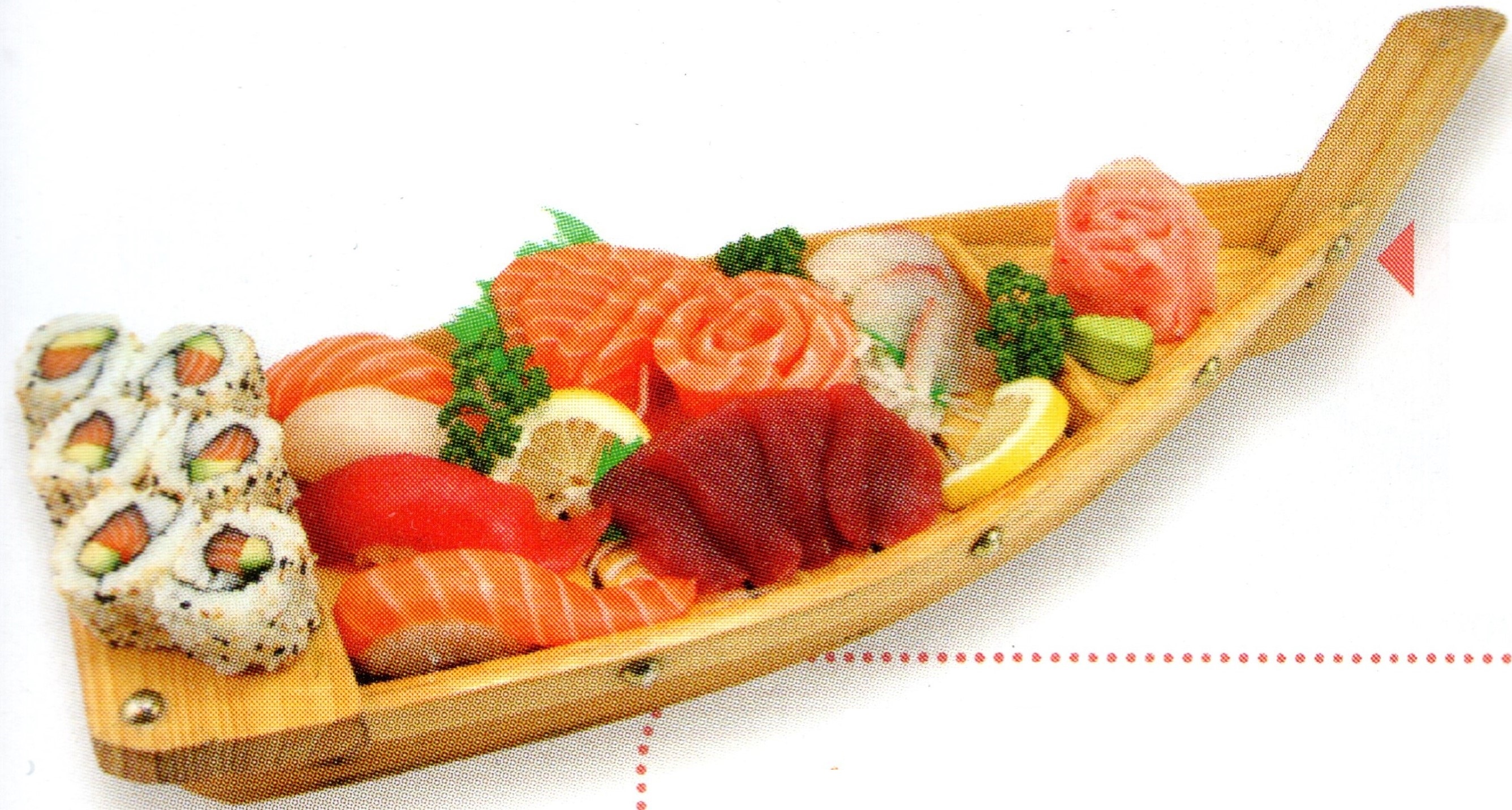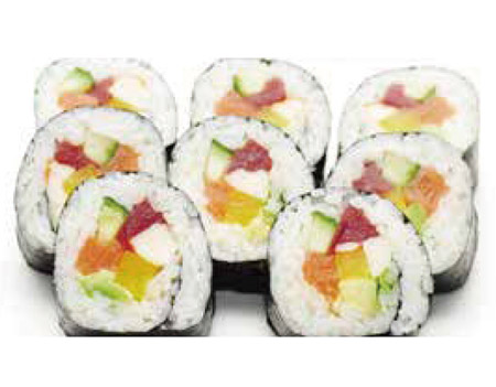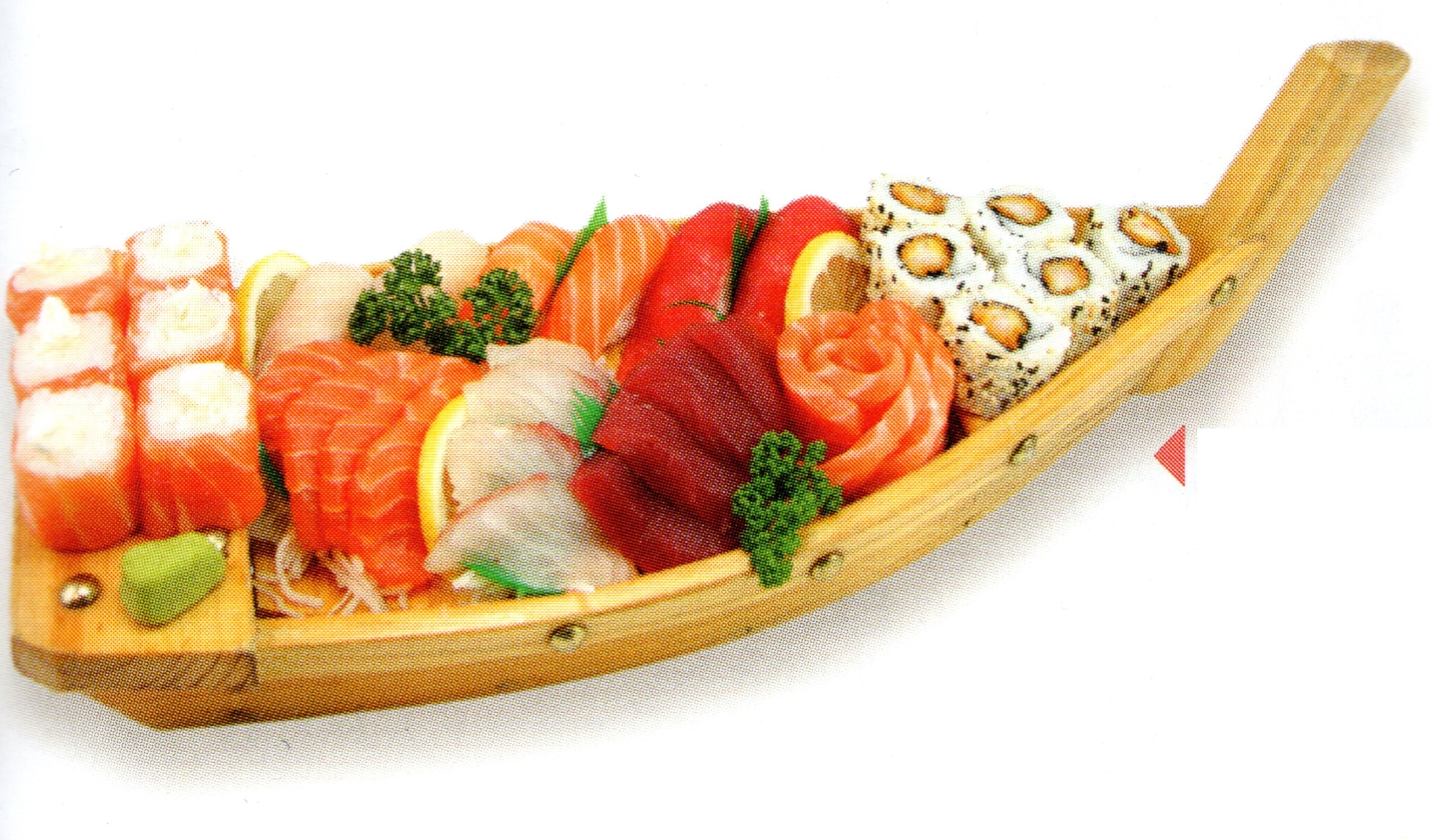 2 soupes, 2 salades, 2 riz, 6 california tempura, 6 délices maki cheese, 6 sushi assortis, 24 sahsimi assortis
