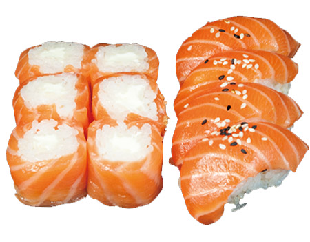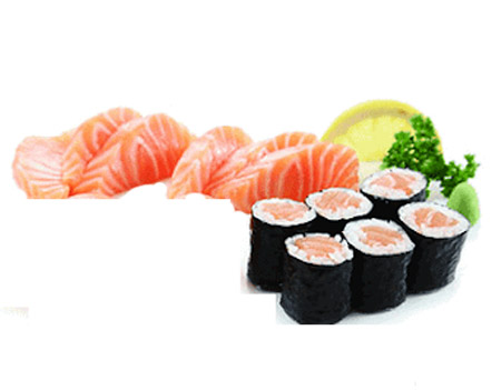 6 sashimi saumon, 6 maki saumon. Entrée au choix : raviolis (6 pcs) ou brochettes (1 poulet, 1 aile de poulet, 1 boulettes de poulet, 1 bœuf au fromage)
