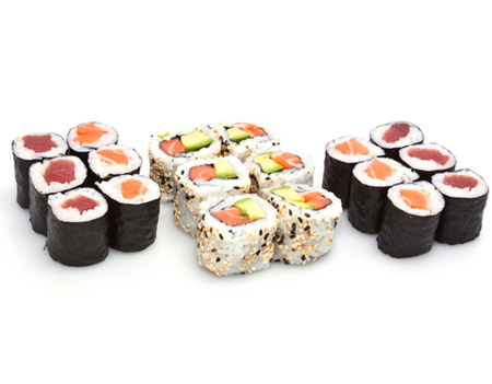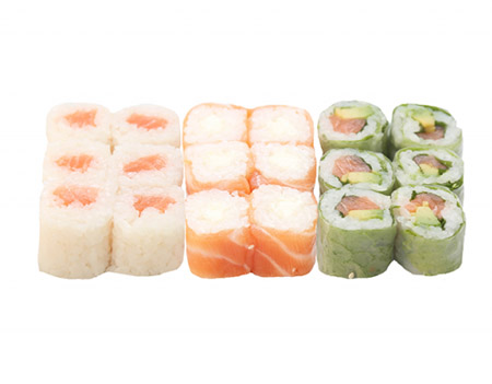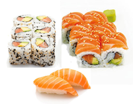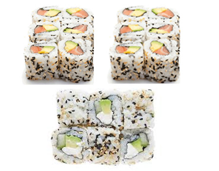 pour 3 personnes : 3 soupes, 3 salades, 12 sushi, 6 maki saumon, 12 california (saumon avocat,surimi avocat) , 6 printemps saumon avocat, 6 omelette saumon, 6 saumon rolls fromage.