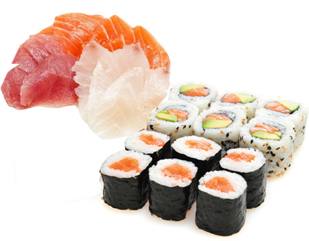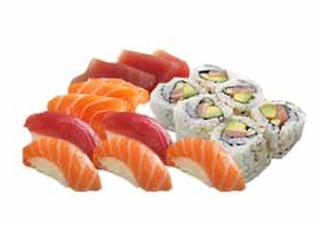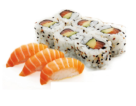 1 riz, 6 maki saumon, 6 california saumon avocat, assortiment de 9 sashimi