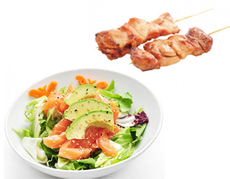 1 soupe, 1 salade, 1 riz, 6 brochettes (2 saumon, 2 thon, 2 gambas)