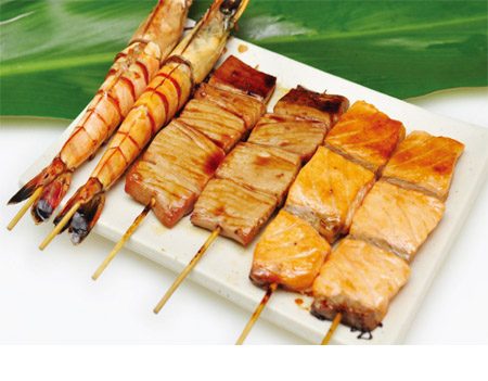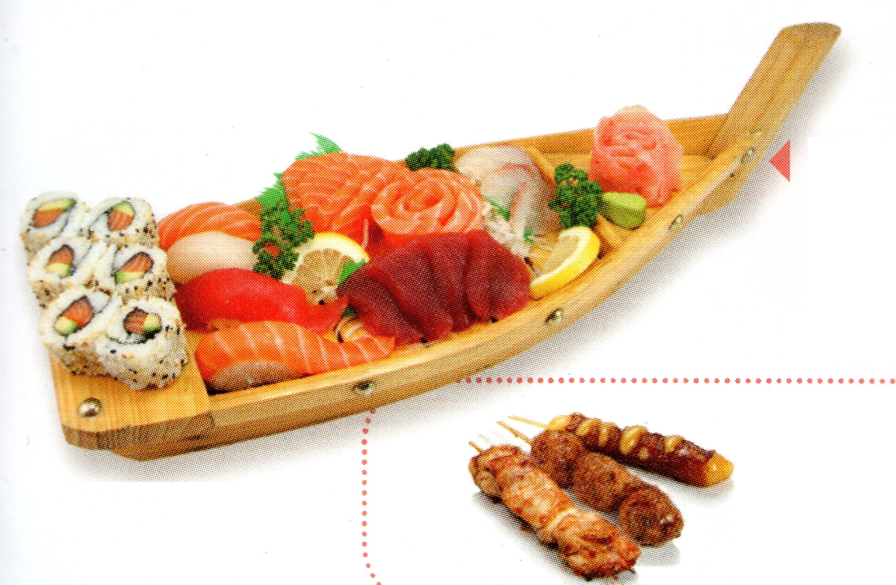 10 sashimi saumon. Entrée au choix : raviolis (6 pcs) ou brochettes (1 poulet, 1 aile de poulet, 1 boulettes de poulet, 1 bœuf au fromage)