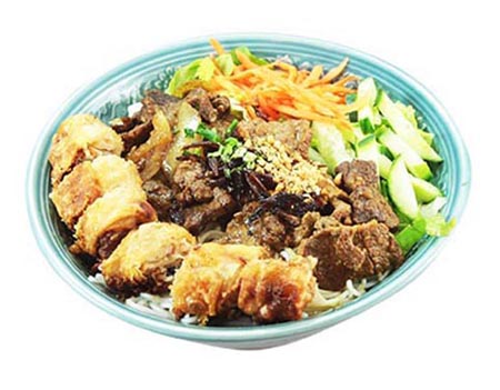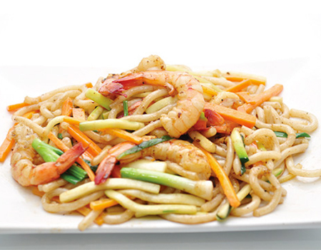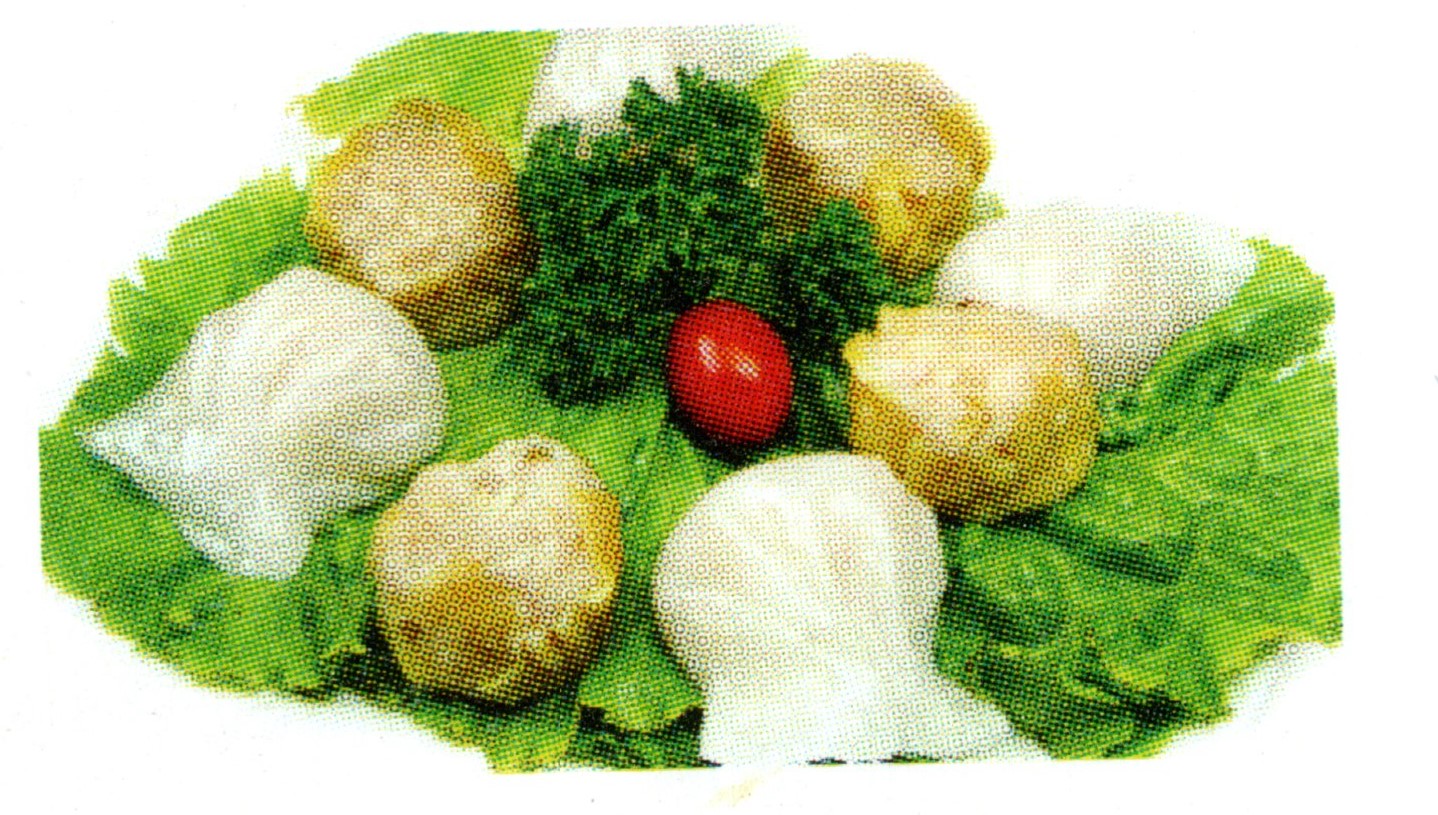 1 soupe, 1 salade, 3 bouchées aux crevettes, 3 raviolis aux crevettes