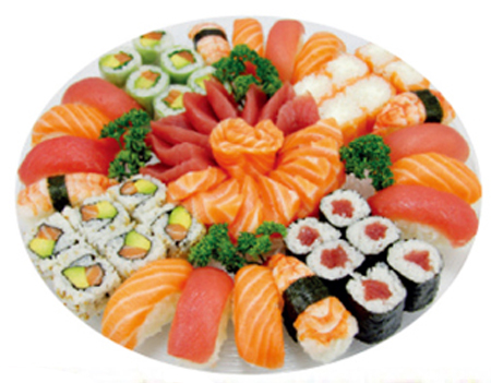 pour 4 personnes : 4 soupes, 4 salades, 4 riz, 16 sushi assortis, 20 sashimi assortis, 6 printemps saumon avocat, 6 délices maki cheese, 6 california saumon avocat, 6 maki thon.